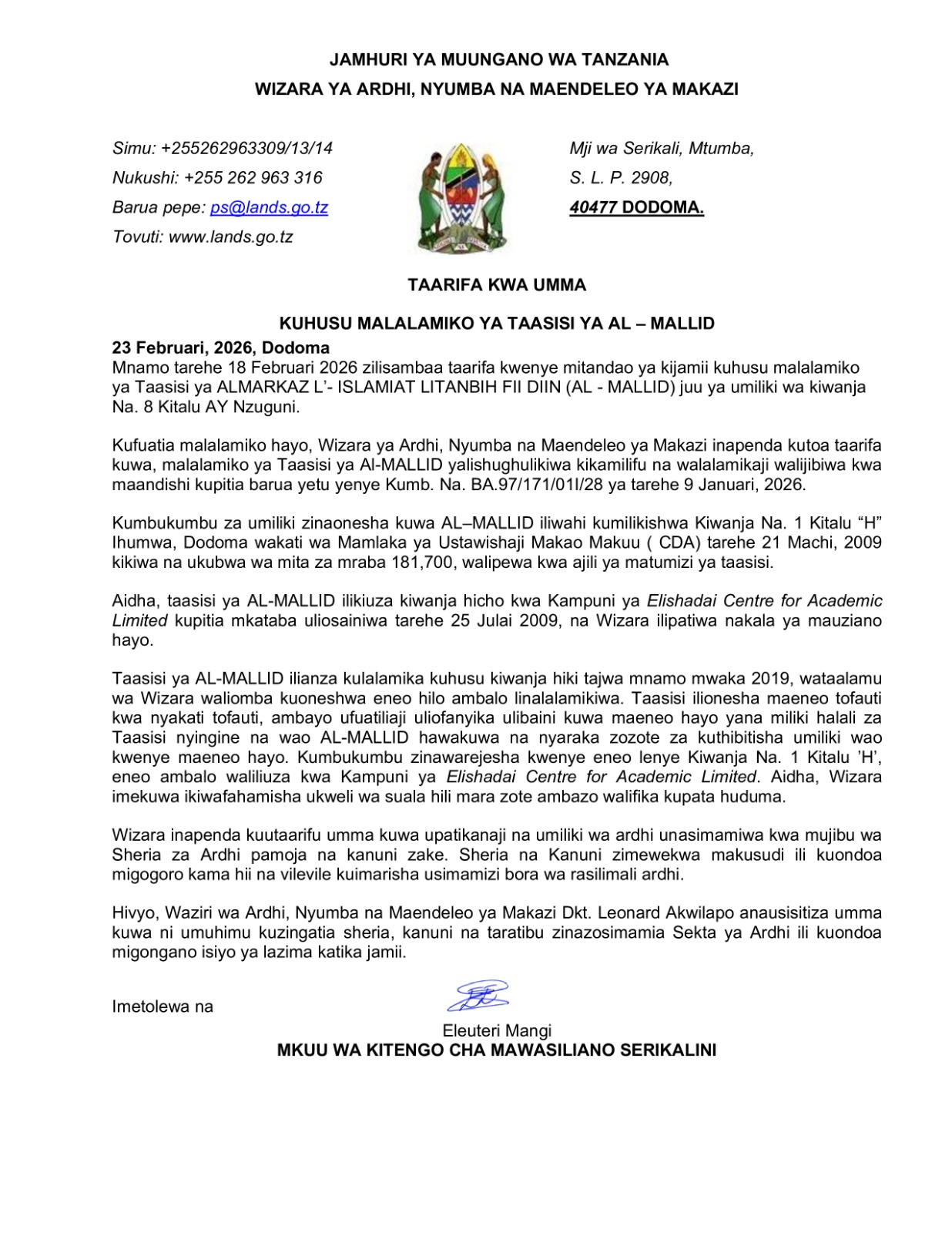 TAARIFA KWA UMMA KUHUSU MALALAMIKO YA TAASISI YA AL - MALLID